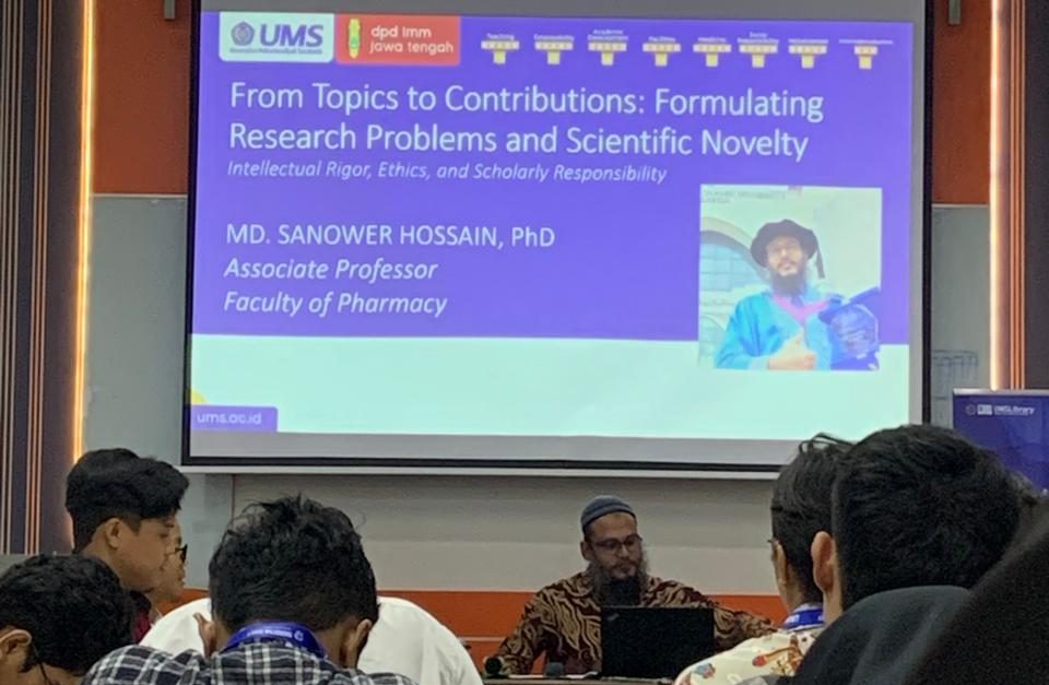 Kegiatan ini berlokasi di Ruang Siti Badilah, Perpustakaan UMS, dengan diikuti oleh sekitar 30 peserta utusan cabang-cabang IMM se-Jawa Tengah dan menghadirkan Md. Sanower Hossain, M.Sc., Ph.D., selaku narasumber. Ia merupakan peneliti spesialis dalam bidang farmakologi, teknologi farmasi, nanomedicine, bioteknologi, dan penemuan.
