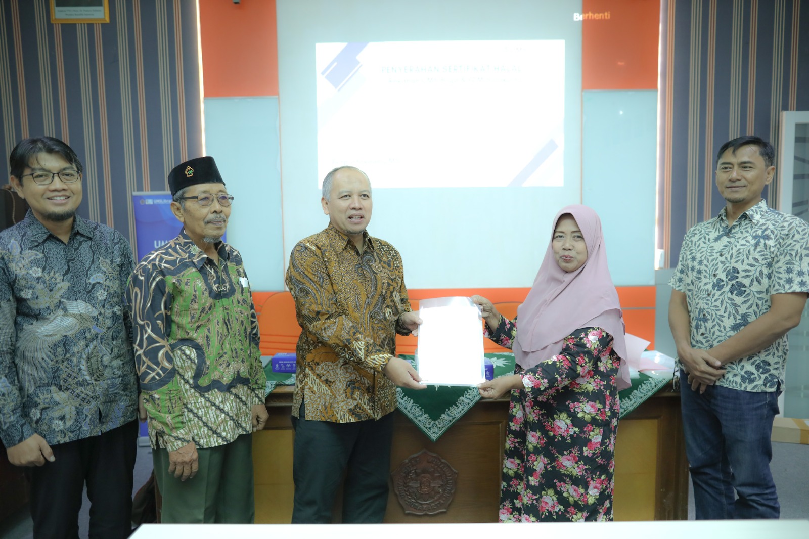 Acara dilanjutkan dengan penyerahan sertifikat halal secara simbolis oleh Wakil Rektor II UMS Prof. Dr. apt. Muhammad Da’i, M.Si., mewakili Lembaga Sertifikasi Halal UMS, bersama Peni Indrayudha dan Pimpinan Majelis Ekonomi Pimpinan Daerah Muhammadiyah (PDM) Kota Surakarta K.H. Drs. Subari.